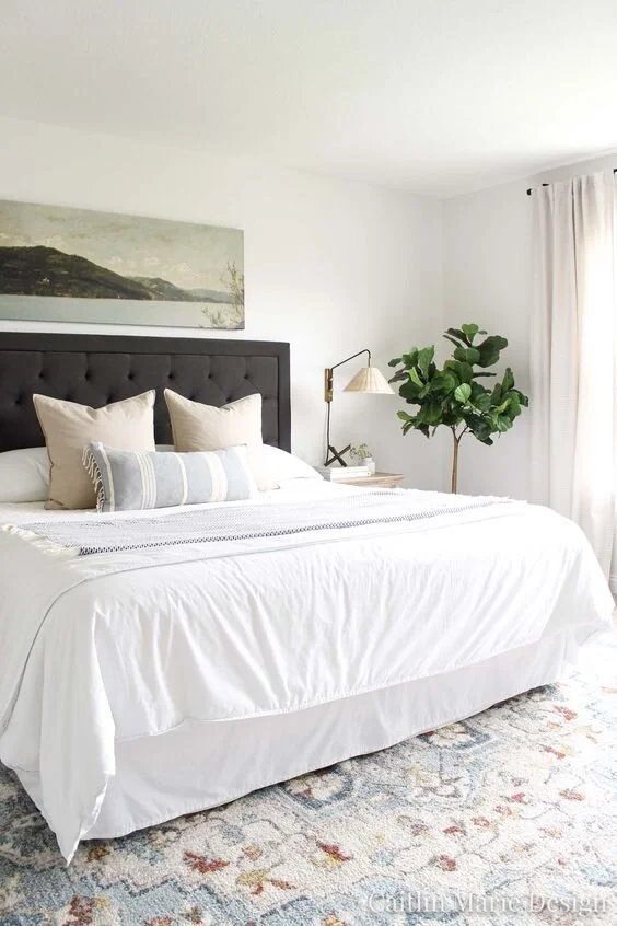 Cooler hues are a better choice in bedrooms because of their calming effect. Think blues, lilacs, shades of gray, and whites. Cooler colors promote rest, while warm tones can often be energizing and more likely to keep you up at night. If you are to go with a warmer color palette, try to keep it muted (stay away from colors like fuchsia or yellow!) and if you want to include a pop of color, keep it limited to one or two accent pillows.