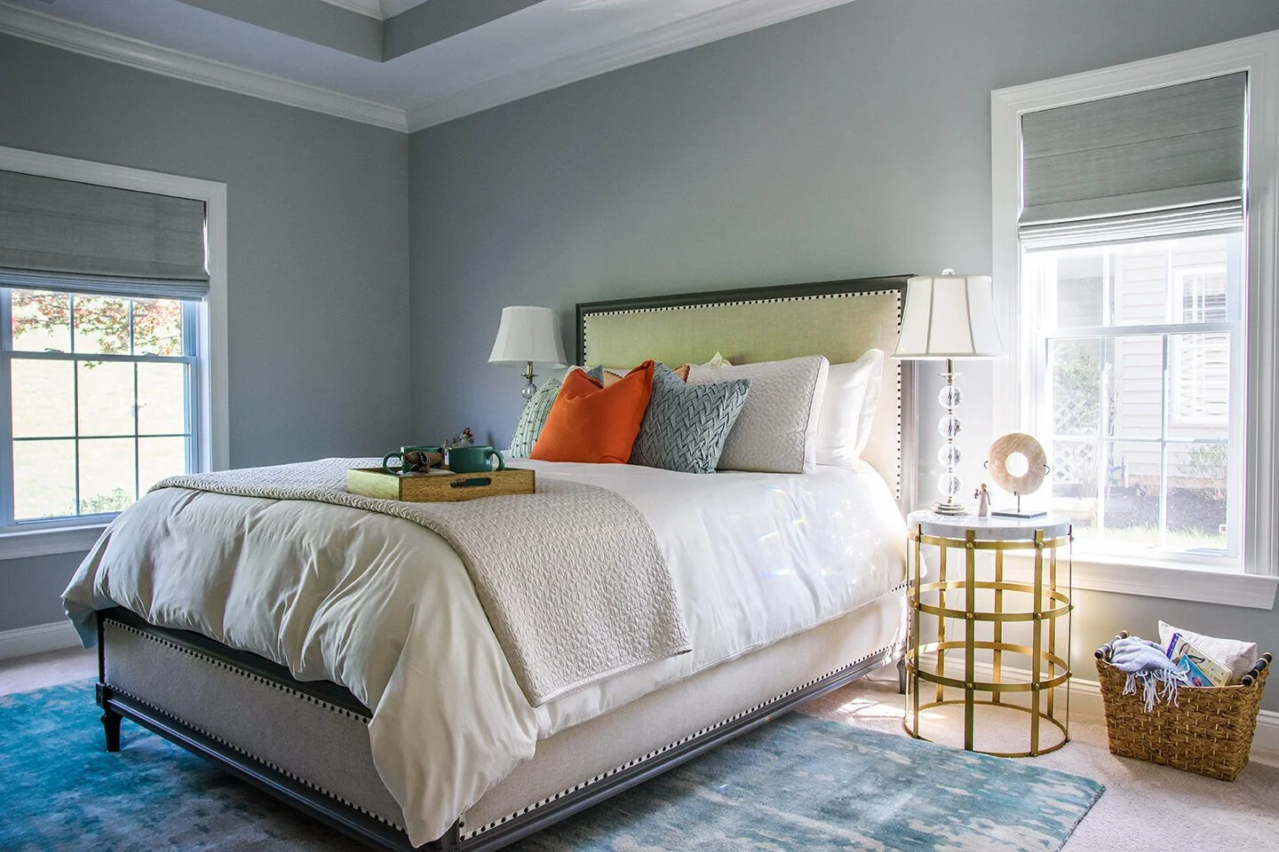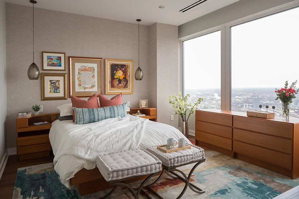 In our Philadelphia Condo Project, we repurposed our client’s warm furniture and included pops of blue in the pillows and rug for a nice contrast.