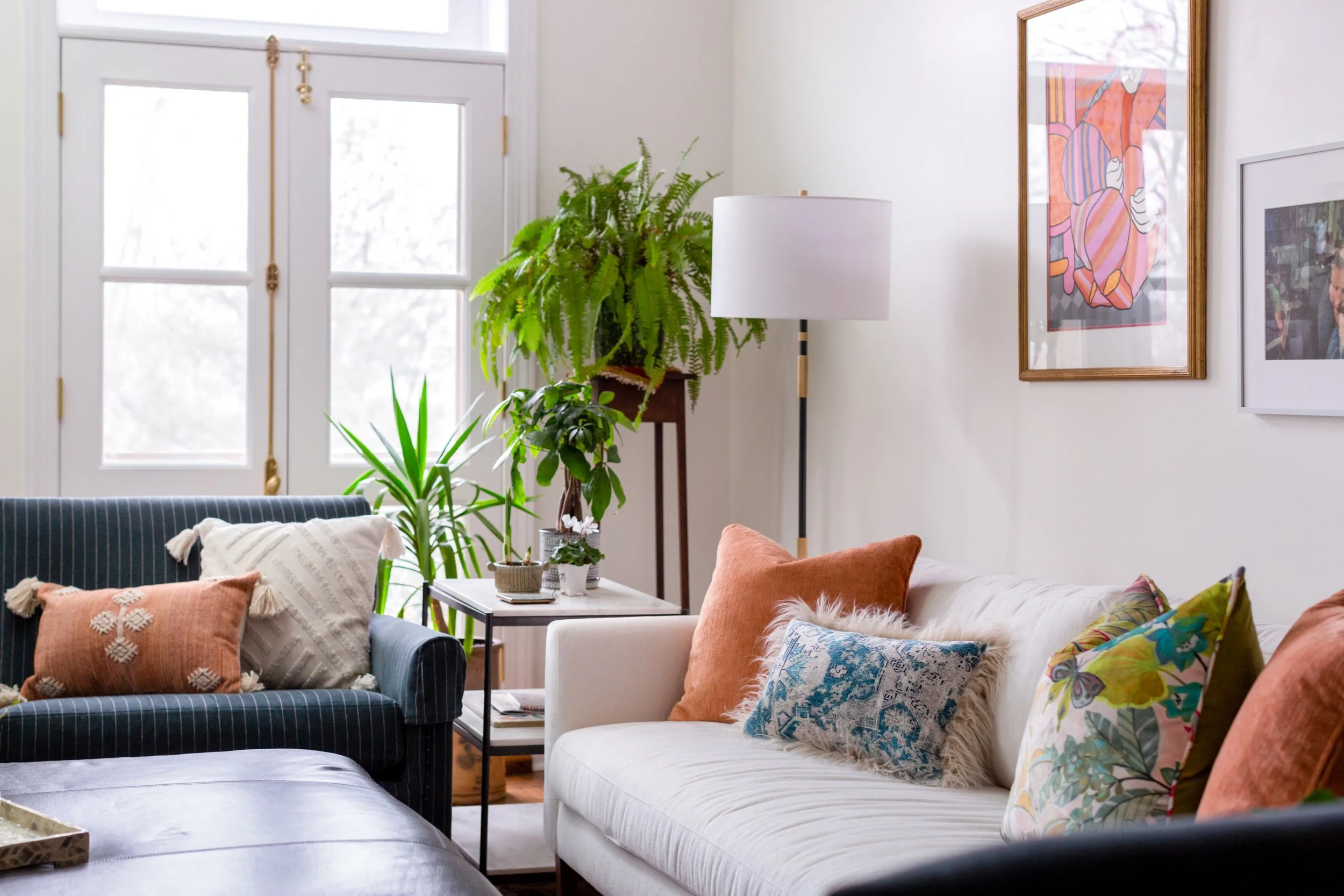 Since you want to make your ceiling look higher, you want to add items that can reflect light. Mirrors bounce the light around and create the illusion of more space, especially in a small living room. Lean them up against the wall or hang them on the wall for maximum effect.