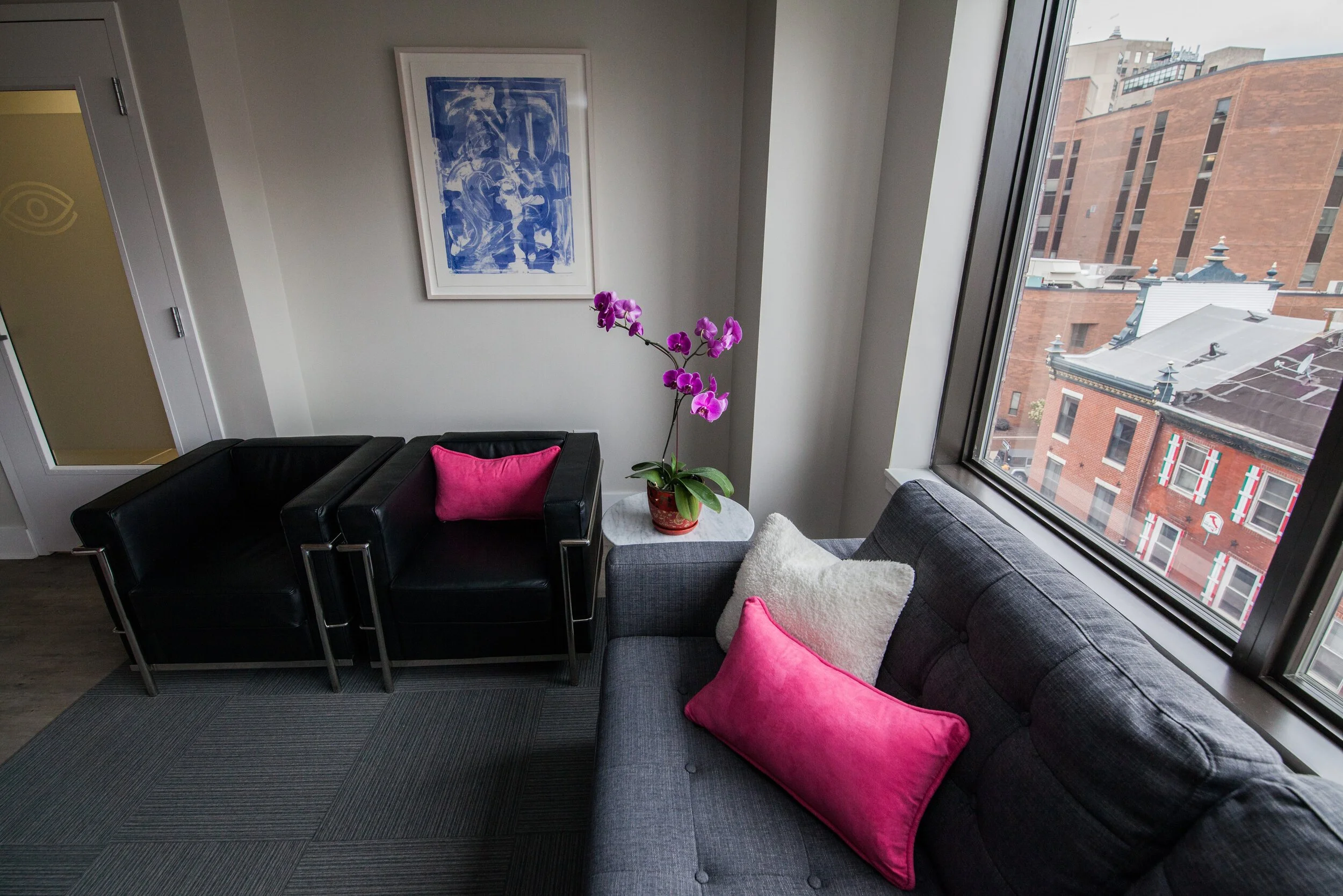 Staying on brand is extremely important for when patients meet you in-person. Keeping with neutral wall colors like white, grey and beige allow you to feature bold accent colors/patterns that are signature to the brand, logo or practice. This ensures that you have cohesive recognizable flow from online to in-person. Ways to implement color when designing your practice is through accent pillows and wall art.